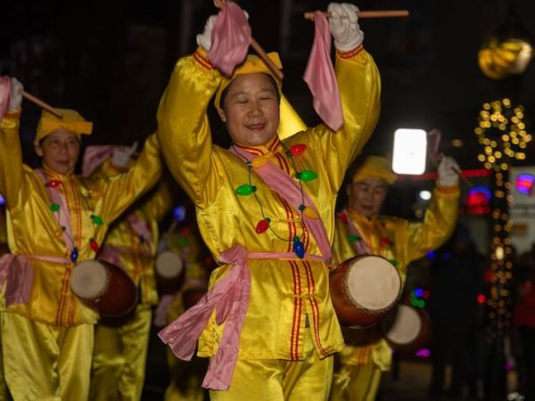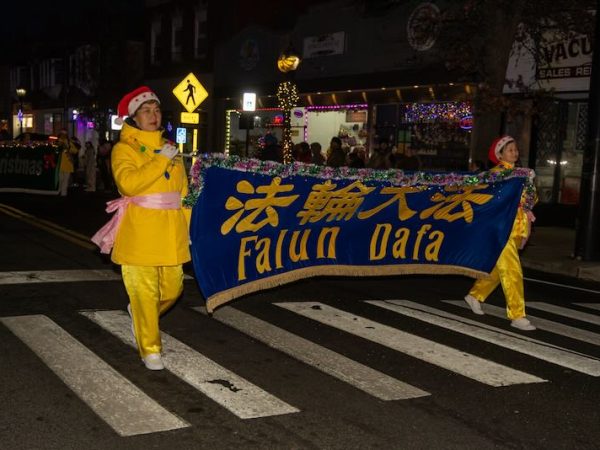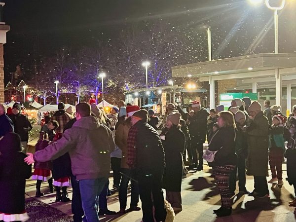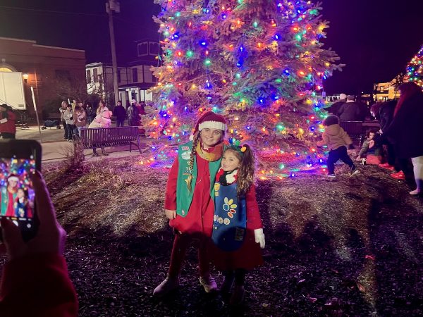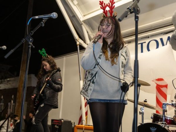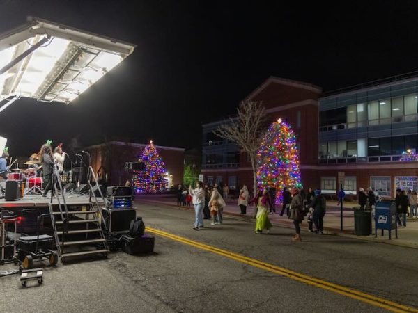 A las 5:30 de la tarde, dos árboles fueron oficialmente iluminados entre aplausos, tiñendo West Second Street de colores. Desde un balcón del Ayuntamiento, Santa y la Sra. Claus saludaron a la multitud. Nieve artificial caía suavemente mientras una banda de estudiantes de East End Arts interpretaba rock clásico y villancicos, animando a los niños a bailar frente al escenario y a los adultos a tararear las melodías.
