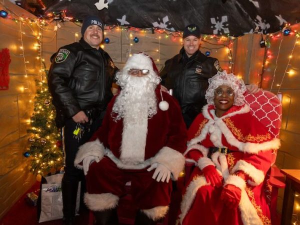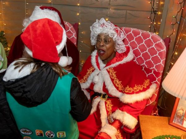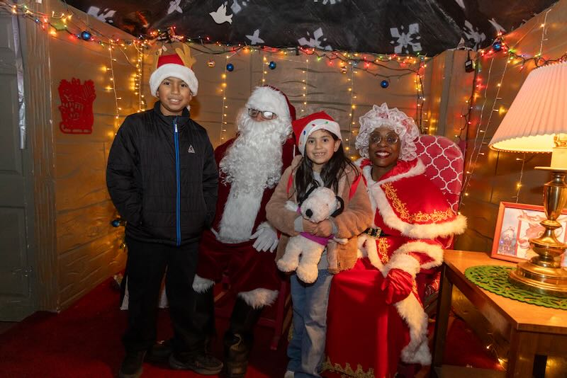 Poco después, las familias se dirigieron al estacionamiento trasero, donde la fogata —trasladada por primera vez desde la zona del río— ofrecía calor a los visitantes. Los niños hicieron fila para entrar en la casita de jengibre de Santa y tomarse fotos.