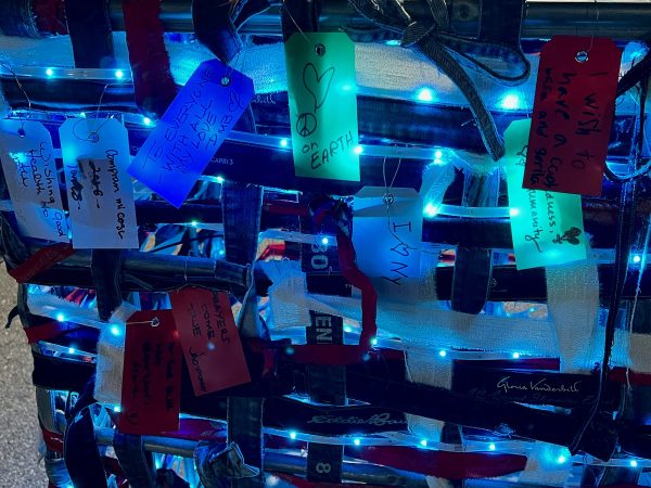 La artista local Sherry Davis, conocida por sus obras comunitarias hechas con materiales reciclados, presentó una nueva escultura navideña llamada “El Gran Tejido Navideño”. Davis, quien anteriormente creó una instalación esférica en Sound Avenue, explicó que el proyecto surgió tras recibir una donación de jeans, de donde le habían sobrado más de mil pretinas de mezclilla que llevaba tiempo guardando “para algo significativo”. Tejió las piezas para crear una enorme caja de regalo coronada por un moño, e invitó al público a completar la obra añadiendo nuevas tiras y colgando mensajes escritos a mano en etiquetas de colores.