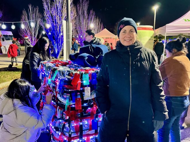 Sherry Davis junto a la escultura The Great Holiday Weave-In que creó para el festival navideño de Riverhead 2025. Foto: Maria del Mar Piedrabuena