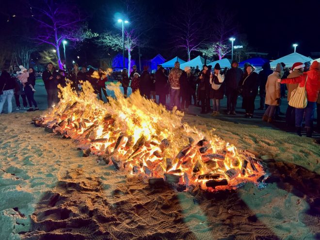 La gran fogata donde cientos se congregaron durante el festival navideño de Riverhead en la parte de atras del ayuntamiento el 6 de diciembre de 2025. Foto: María del Mar Piedrabuena