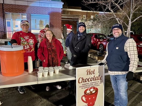 El Riverhead Moose Lodge patrocinó un puesto de chocolate caliente gratuito que rápidamente se convirtió en uno de los puntos más concurridos de la tarde. Los voluntarios del Moose Lodge, Blaze Church, Peconic Bay Power Squadron y el Club de Leones de Riverhead habían entregado cerca de mil vasos para las 6:30 de la tarde, según explicó la organizadora Dianne Sherman.
