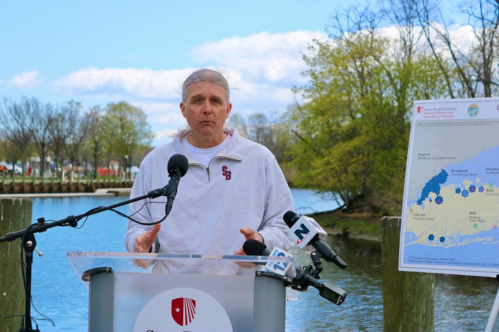 El profesor Christopher Gobler, titular de la Cátedra de Economía Costera y Conservación de la Universidad de Stony Brook, aborda el deterioro de las aguas costeras en Long Island el martes 21 de abril de 2026, en el frente fluvial del Peconic. RiverheadLOCAL/Denise Civiletti
