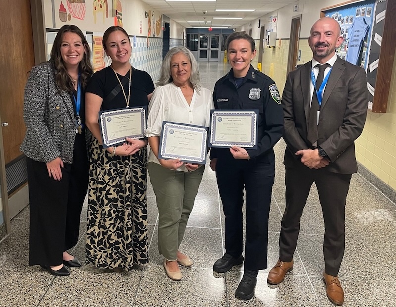 Cuatro miembros del personal del Distrito Escolar Central de Riverhead fueron homenajeados la semana pasada por la Junta de Educación por su respuesta ante una situación de emergencia en la escuela primaria Aquebogue.