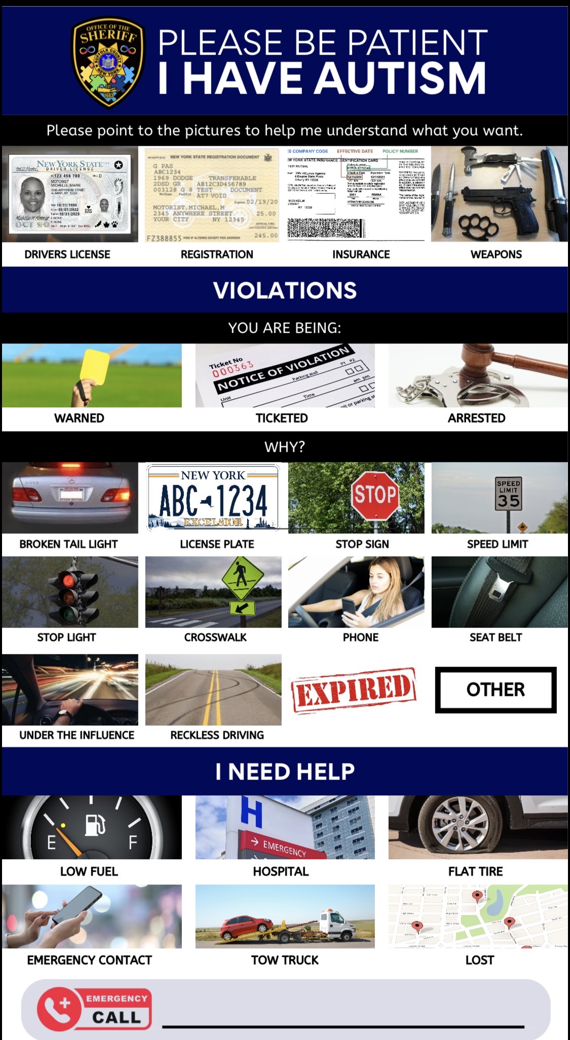 Tarjetas como estas, facilitan la comunicación entre los oficiales y una persona que se encuentre en el espectro autista. Foto: Oficina del Alguacil del condado de Suffolk.