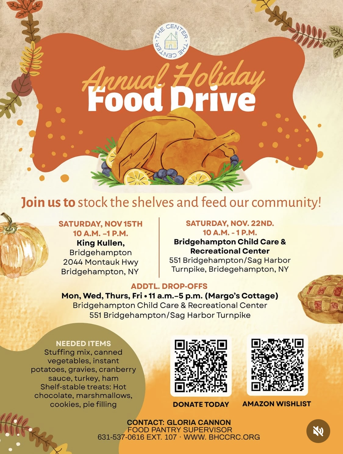 Desde el sábado, está en marcha la colecta anual de alimentos del Centro de Cuidado y Recreación Infantil de Bridgehampton, con una brigada de recolección de víveres en el supermercado King Kullen de esa localidad, que se llevó a cabo entre las 10 de la mañana y la 1 de la tarde, y que continuará el próximo sábado 22 de noviembre en la sede del centro comunitario, ubicada en el 551 de Bridgehampton Sag Harbor Turnpike.