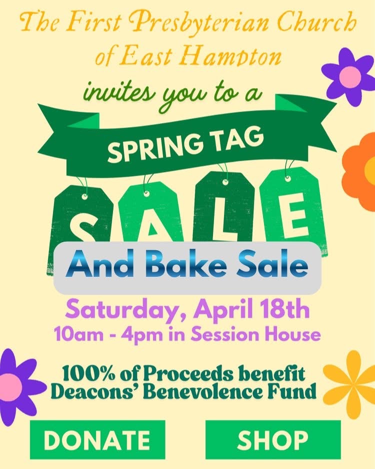La Primera Iglesia Presbiteriana de East Hampton invita al público a participar en su “Spring Tag Sale”, que se llevará a cabo HOY sábado 18 de abril, hasta las 4 de la tarde. El evento tendrá lugar en la sede de la iglesia, en el 120 de Main Street, en East Hampton.