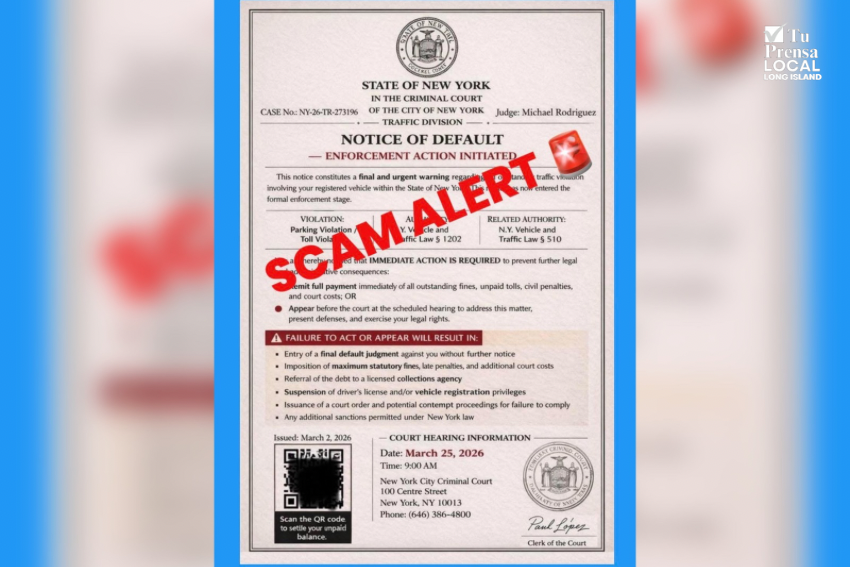 De acuerdo con una publicación del fiscal de distrito del condado de Suffolk, los delincuentes están enviando notificaciones falsas que aparentan ser documentos oficiales relacionados con infracciones de tránsito o estacionamiento. Estos mensajes suelen incluir enlaces o códigos QR que redirigen a las víctimas potenciales, a páginas fraudulentas diseñadas para robar datos bancarios o exigir pagos inmediatos.