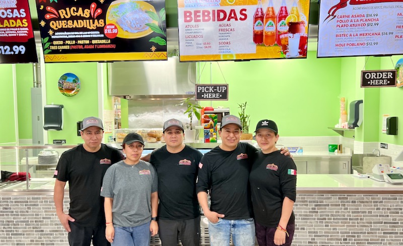 Raúl de Jesús Dorado y Xiomara Guevara (a la derecha), junto a miembros del personal —de izquierda a derecha: Roman de Jesus, Mary Ramirez y Rodolfo de Jesus—, en el interior de la recién inaugurada Casa Dorado, ubicada en el 221 de E. Main St., en mayo de 2025. Foto: Alek Lewis