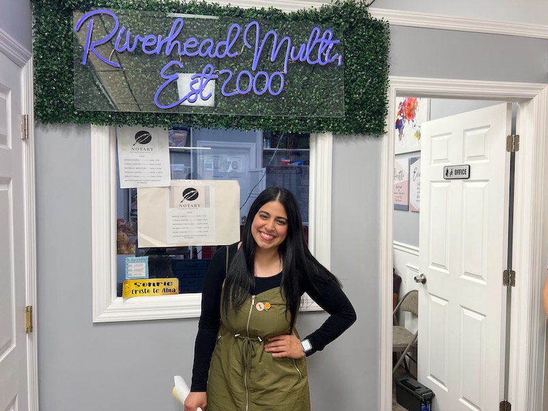 Erika Mera, cuya familia es propietaria de Riverhead Multiservices en West Main Street desde hace 25 años, informa de una drástica disminución en el negocio y de un aumento en el número de clientes que acuden para notarizar documentos de tutela y poderes notariales, con la esperanza de proteger a sus hijos en caso de ser detenidos por el ICE. Foto: Maria del Mar Piedrabuena