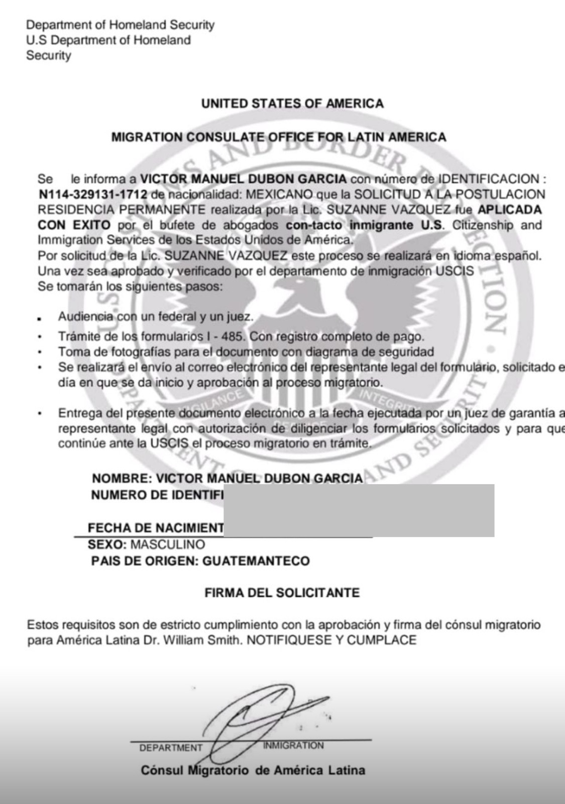 “Me dice, soy Suzanne Vásquez, la representante del bufete Contacto Inmigrante y soy la persona indicada para llevar su caso”, dijo Dubon García. “Me pidió toda mi información, me pidió la información de mis papás, de algunos de mis hermanos, si tenía hijos, todo eso yo se lo mandé. Incluso me pidió mi permiso de trabajo, y yo se lo mandé, me pidió el social pero le dije, lo siento pero el social no se lo puedo dar. Ella me dijo ‘no se preocupe, de todas maneras ya inmigración tiene sus datos y su número de social’”.