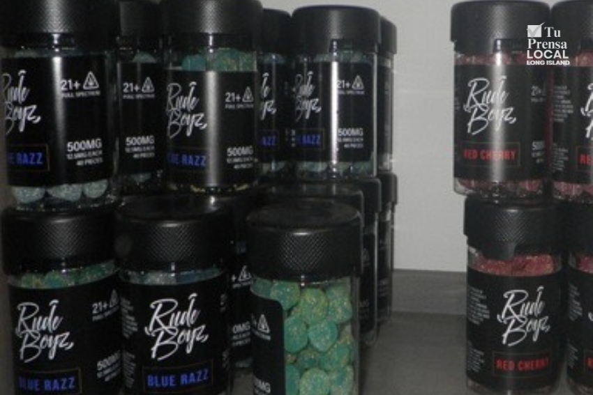 La policía confiscó 100 libras de cannabis, productos comestibles, sustancias alucinógenas y más de 50,000 dólares en efectivo en operativos realizados el jueves 23 de octubre de 2025, en establecimientos del condado de Suffolk. Foto: Policía del condado de Suffolk.